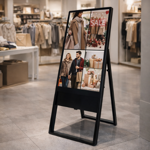 A sleek A-type digital easel with an integrated Philips LED panel and Android media player, designed for high-impact indoor advertising, promotions, and brand messaging.
